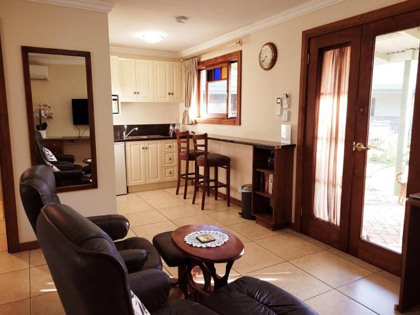 Studio Apartment. Studio apartments face east, offering lovely garden and rural views. Choose between a king bed or two single beds when booking. Use the kitchenette in your studio, with microwave, fridge and tea and coffee making facilities, to prepare your meals. Enjoy eating at the breakfast bar or while sitting at the table and chairs outside your studio, being entertained by the local birdlife. Studios also contain flat-screen TV, airconditioner, extra blankets and pillows, Wander down the garden to the swimming pool. ;