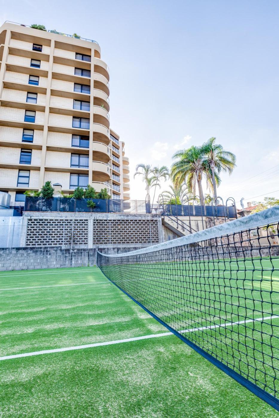 Shared facilities include a swimming pool, spa, sauna, BBQ and a tennis court.