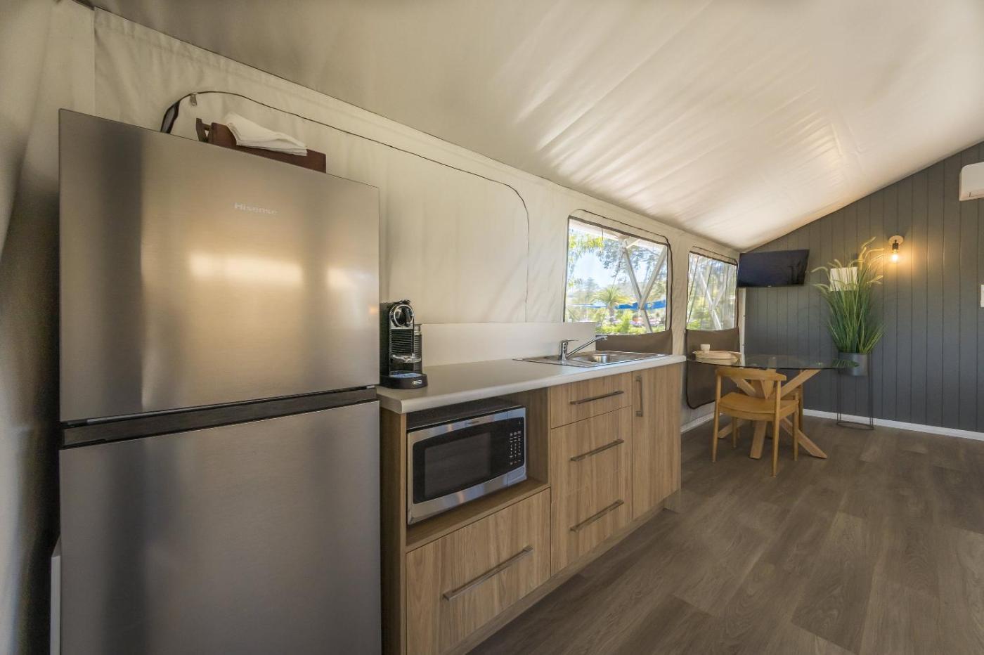 Tent. The tent features air conditioning, a coffee machine, as well as a private bathroom boasting a shower and a hairdryer. Guests will find a stovetop, a refrigerator, a dishwasher and kitchenware in the fully equipped kitchenette. The tent also comes with a barbecue. The tent offers a seating area, a dining area, as well as a patio and outdoor furniture. The unit has 1 bed. ;