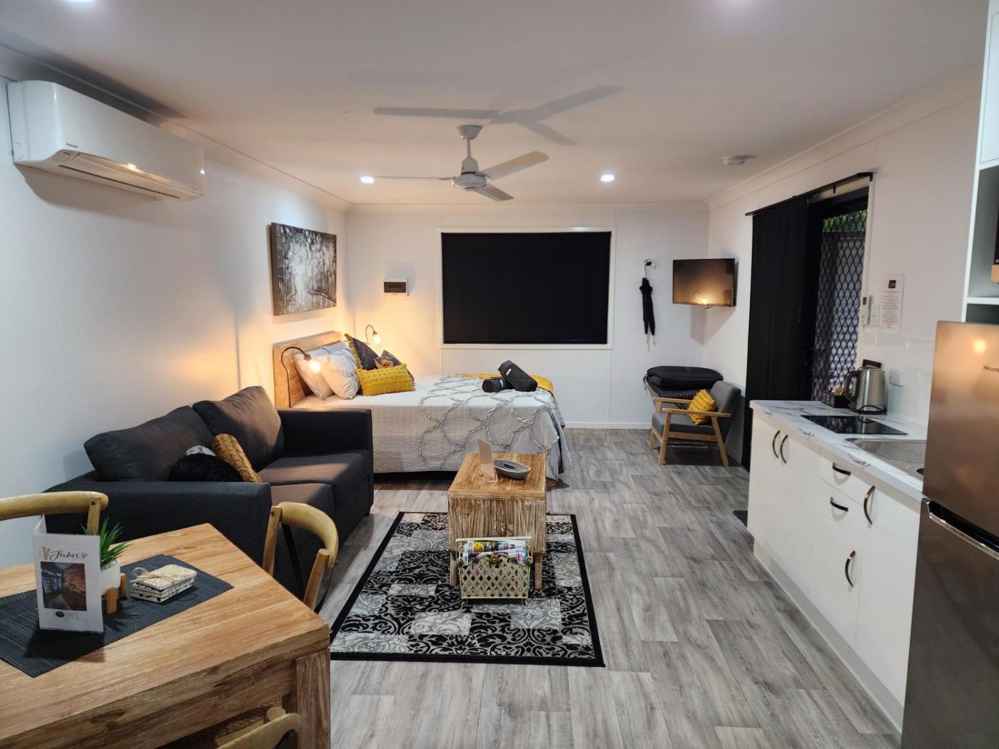 Deluxe Queen Studio. Featuring free toiletries, this studio includes a private bathroom with a shower and a hairdryer. Guests will find a refrigerator, kitchenware, a microwave and a toaster in the fully equipped kitchenette. The studio also includes a barbecue. The studio features a tea and coffee maker, a dining area, a wardrobe, a flat-screen TV, as well as garden views. The unit has 1 bed. ;