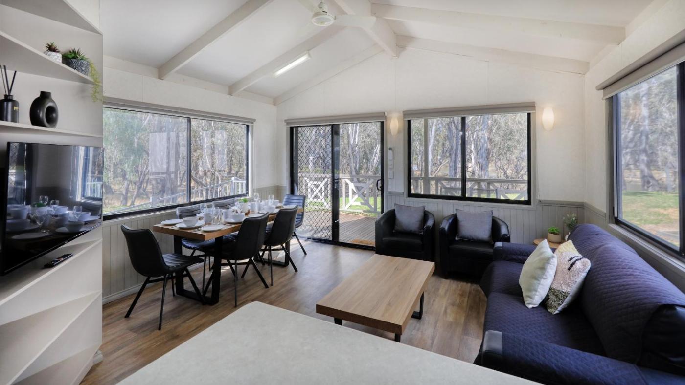 Riverview Villa Henty. This bungalow includes 1 living room, 2 separate bedrooms and 1 bathroom with a shower and free toiletries. Guests will find a stovetop, a refrigerator, a dishwasher and kitchenware in the fully equipped kitchen. The bungalow also features a barbecue. This bungalow is air-conditioned and has a seating area with a flat-screen TV, soundproof walls, a tea and coffee maker, a dining area, as well as a wardrobe. The unit has 5 beds. ;