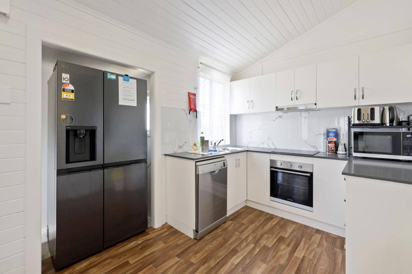 Holiday Home. This holiday home has a sofa, iPod dock and washing machine. Please note, the bathroom is via the veranda. Guests will need to go though a door onto the veranda to access the bathroom.