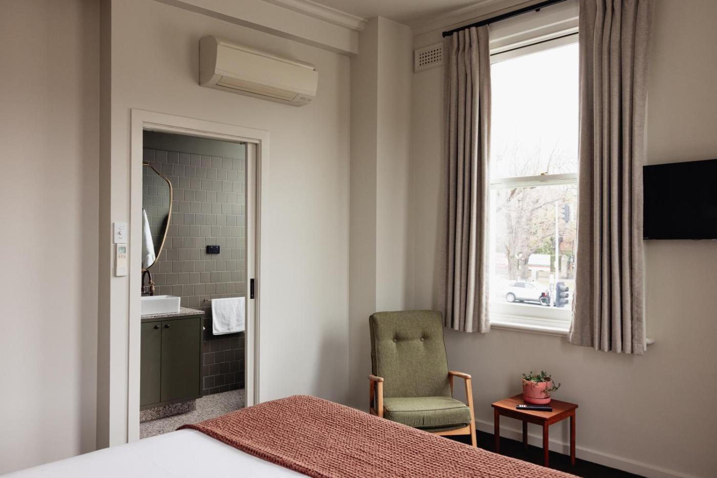 The hotel’s restaurant overlooks Royal Parade and is open for lunch and dinner. It offers traditional pub meals with a focus on ethically and locally sourced produce. The bar serves local and imported beer and wine.