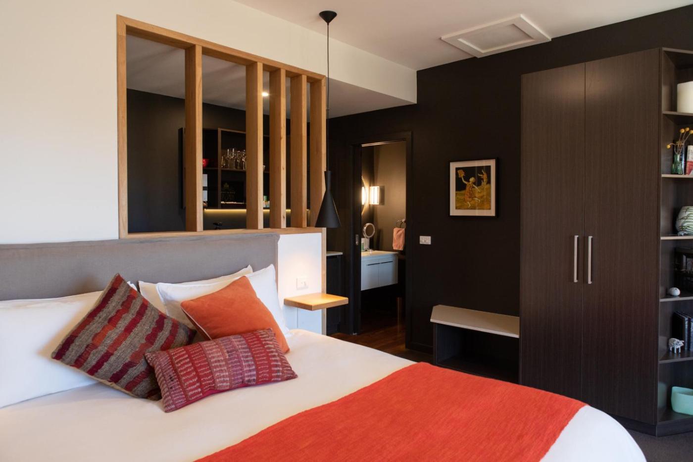 King Suite. Located in a newly renovated wing of the property, this king room features luxurious interiors, contemporary furnishings, vibrant art and floor-to-ceiling windows to take in the spectacular views of the Delatite Valley. The room has ample space for you to spread out in and features a lounge, dining area and private outdoor terrace heated by a fireplace. Each room has a Nespresso coffee machine and selection of Harney & Sons Fine Teas.