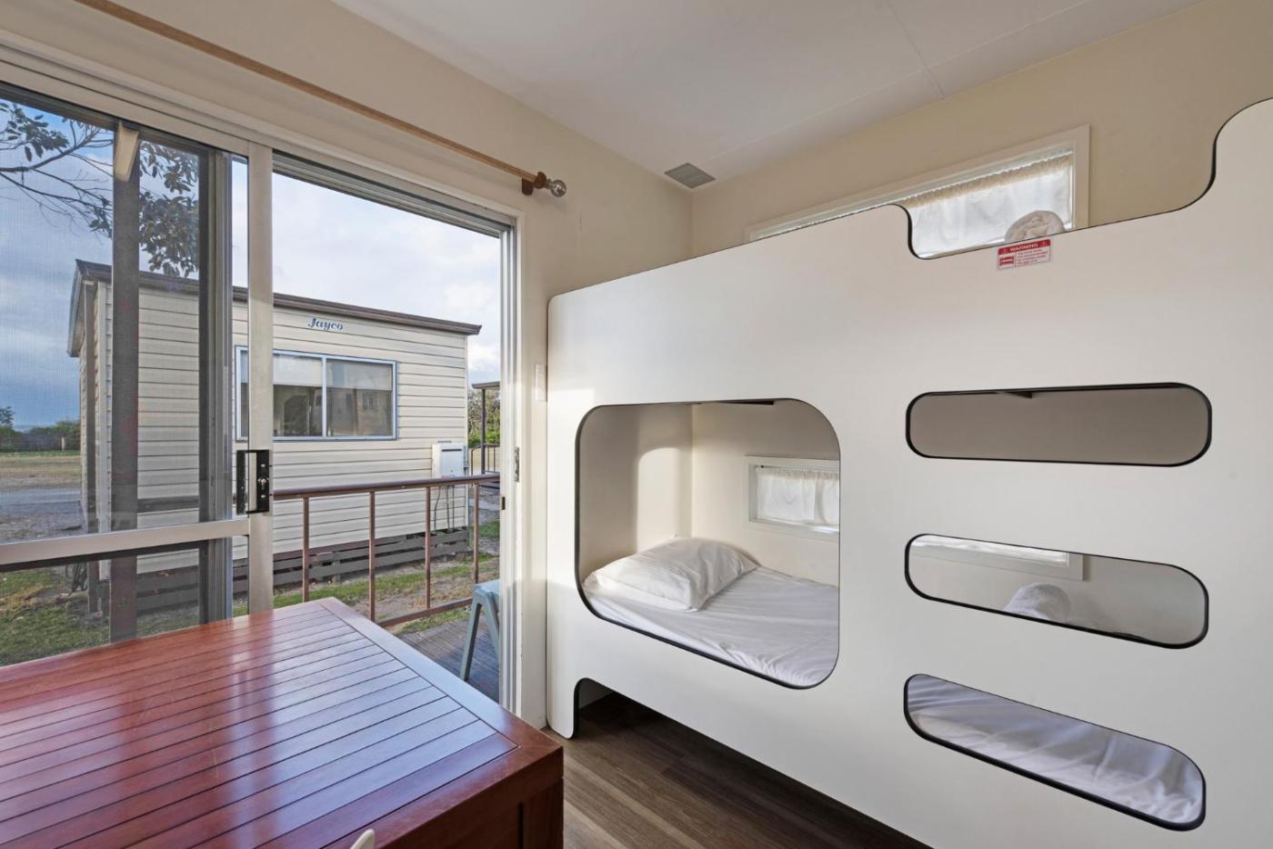 Economy Cabin - Sleeps 5. These cabins include a kitchenette, TV, electric heating and an en suite bathroom.cabins have a small covered patio with a dining table and chairs. Each cabin has a double bed in the master bedroom and a bunk bud adjacent to the living room and day bed in lounge room.linen is provided. Please note that the price is based on 2 guests. Maximum occupancy is 6 (see Hotel Policies). ;
