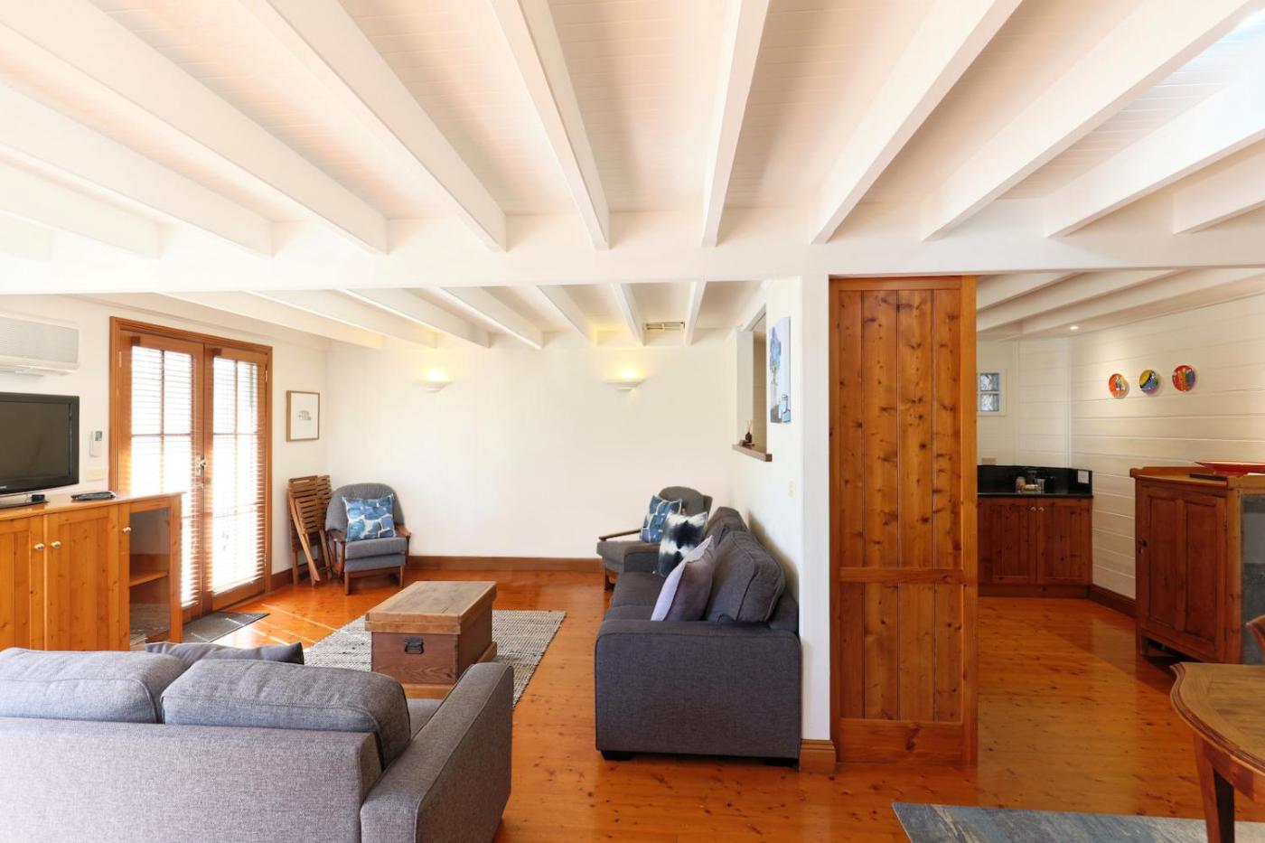 Premier Cottage. Offering timber flooring throughout, the Cottage is a two storey building. It includes a luxury king suite and second attic room with a single bed and bathroom on the first floor. The living and dining are located on the ground. The spacious dining area offers a spacious lounge seating. The bathroom has shower (that requires a step overin) and a toilet. A separate second toilet is located on the ground floor. The Cottage also includes a fully equipped kitchen with a dishwasher and oven. A washing machine and dryer is provided. A fold out sofa bed is available if required.