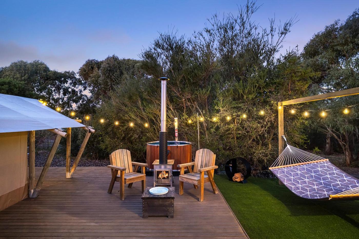 Deluxe Three-Bedroom Glamping Tent - Safari. This chalet offers a fireplace. This chalet comprises 1 living room, 3 separate bedrooms and 1 bathroom with a walk-in shower and free toiletries. Meals can be prepared in the kitchenette, which comes with a stovetop, a refrigerator, kitchenware and a microwave. The air-conditioned chalet provides a flat-screen TV, a coffee machine, a seating area, a barbecue as well as garden views. The unit offers 3 beds. ;
