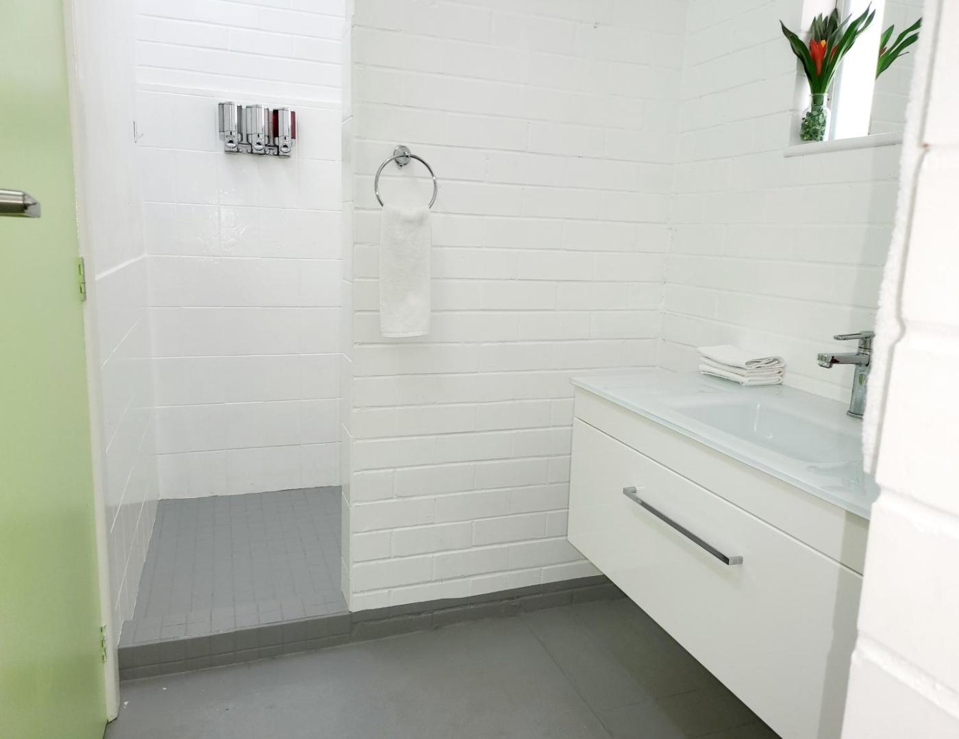 Family Room (4 Adults). This room has 1 queen bed and 3 single beds, a dining table and 5 chairs, crockery and cutlery for 5, a microwave, fridge, kettle and a toaster. There is a TV and a bathroom with a shower, toilet and vanity. Parking is located directly outside the front door. ;