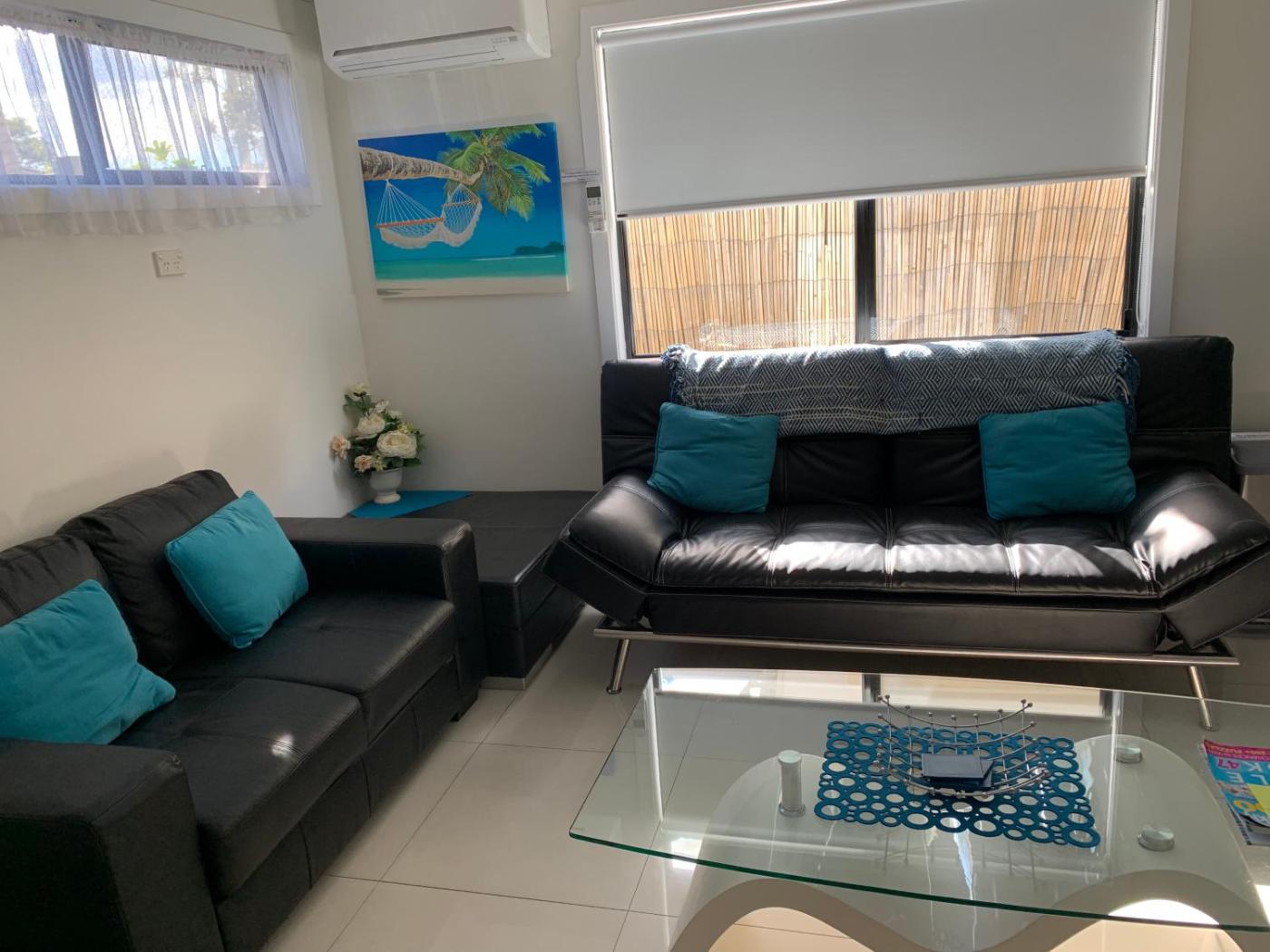Two-Bedroom Villa. The full self-contained villa has air conditioning, a refrigerator and an open-plan living area.