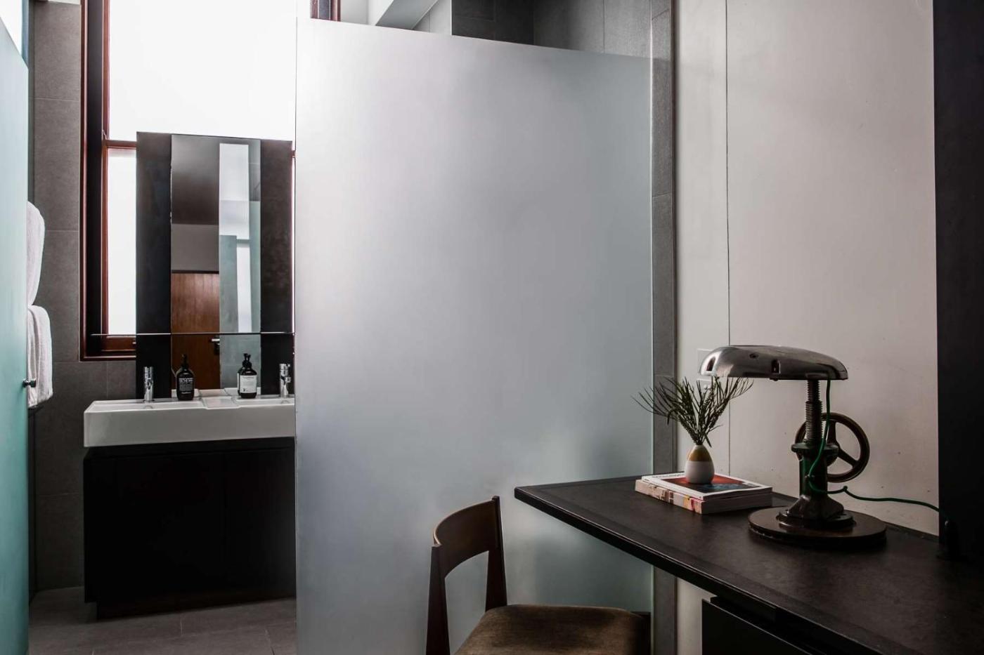One-Bedroom Loft Suite - Chippendale. This spacious, modern, loft-style room features a private bedroom and sitting area and vintage designer furniture, lamps and modern bathrooms with separate bathtub and rain shower, with dual his and hers vanities. It also includes an HD Smart TV, free toiletries, bathrobes, free WiFi and free local calls. It has a king-sized bed and a white marble bathroom. ;