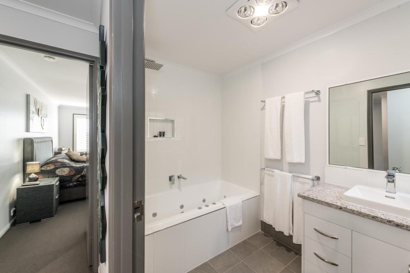 Three-Bedroom Apartment. Located beside the main property building, this fully self-contained apartment features split-system air-conditioning, Smart TVs, a sofa and cooking facilities with a dishwasher, kettle and full-size fridge. Also included is a single car lock up garage, private courtyard and balcony. Spa rooms are upon request and subject to availability. Bedrooms only accessible by stair use