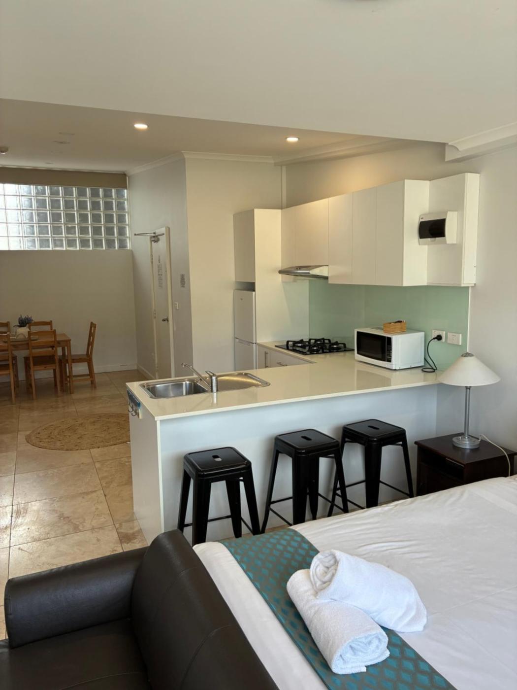Queen Studio - Disability Access. Offering free toiletries, this studio includes a private bathroom with a walk-in shower. The well-fitted kitchen has a stovetop, a refrigerator, kitchenware and a microwave. This wheelchair accessible studio features air conditioning, a seating area with a flat-screen TV and a roll-in shower. The unit offers 1 bed. ;